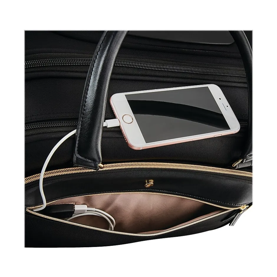 A little bit of everything in one bag. The Samsonite Mobile Solution rolling briefcase combines practicality, style, and functionality in a silhouette perfect for adapting to the office, through your commute, and overnight. Nylon twill fabric rolling briefcase dedicated compartments provide enough space to fit most tablets up to 9.7″ along with laptops up to 15.6″ while separate packing area allows you to store additional travel or business items. Integrated USB port and wireless charging pocket provide effortless charging on the go.