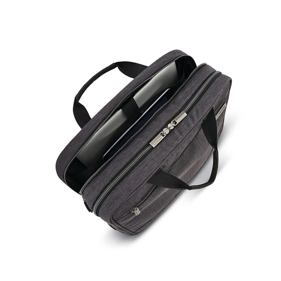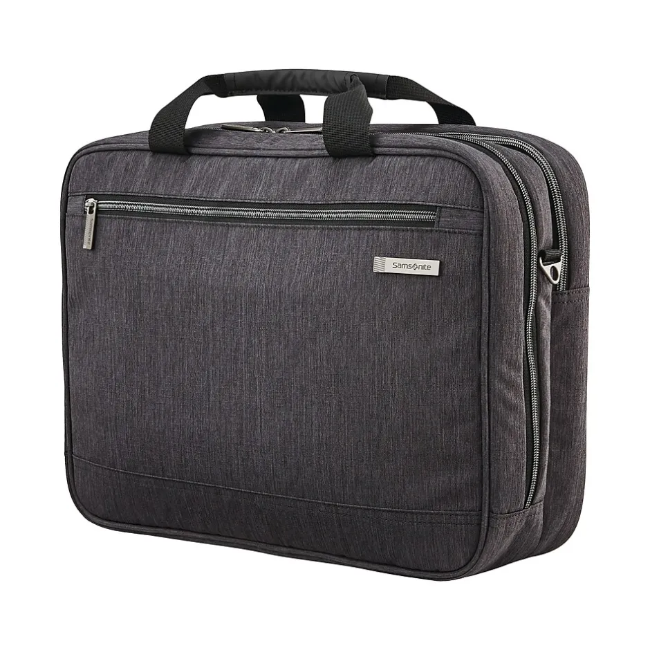 The Samsonite Modern Utility briefcase is designed to fit a more casual lifestyle and is your go-to business accessory. Thoughtful organization for all your tech needs, it provides a relaxed yet sophisticated look for your everyday needs. Sleek and compact, the modern Samsonite briefcase is perfect for business and beyond. With a fully padded main compartment, additional organization in the front pocket, and detachable strap, this briefcase is ready to go wherever you do. Features two-tone polyester ripstop with matte gunmetal hardware. The SmartSleeve fits over most upright luggage handles for easy mobility. Adjustable, removable shoulder strap is padded for extra comfort. Offers fully featured organization panel.
