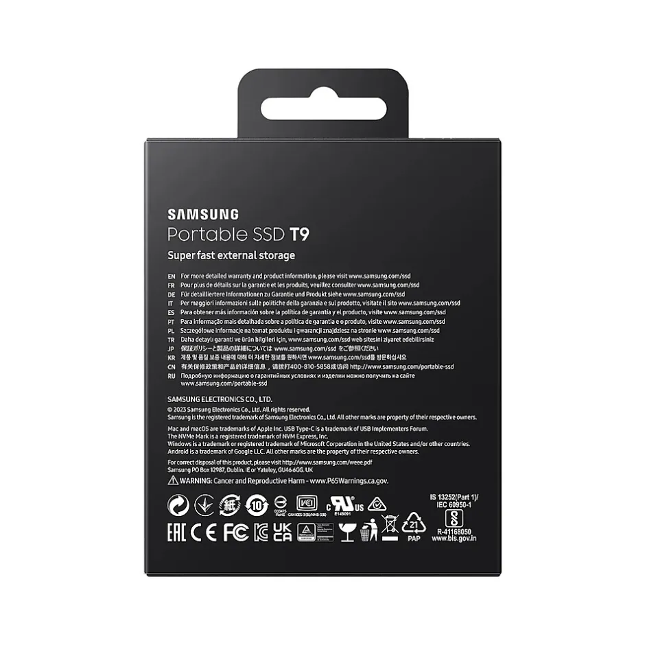 Enhance workflow efficiency with Samsung T9 1TB USB 3.2 portable solid state drive, boasting sequential read/write speeds of up to 2,000 MB/s through its USB 3.2 Gen 2×2 interface. T9 is compatible with Windows, macOS, Android phones and tablets, gaming consoles and 12K camera. Rest assured. T9 offers up to 3 meters drop resistance and is backed by a 5-year limited warranty.