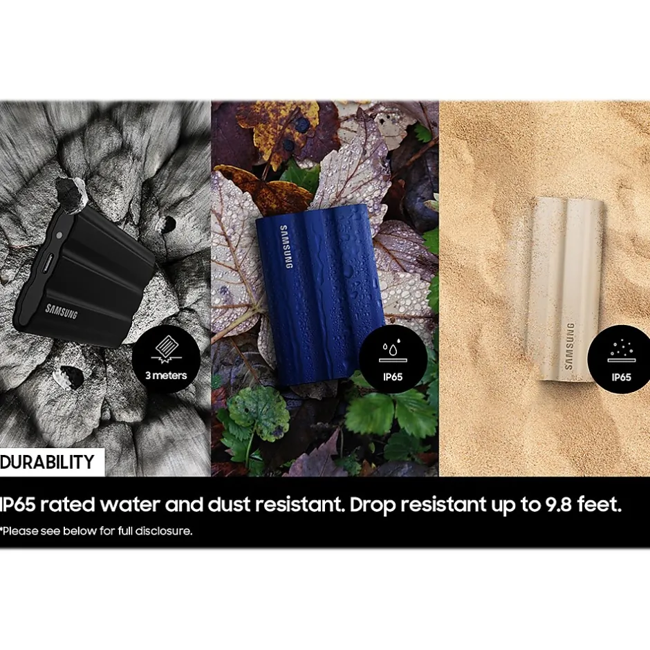 Tough, fast, and compact. The rugged T7 Shield SSD is built to endure with the space to create, thanks to an IP65 rating for dust and water resistance. Transfer massive files in seconds: USB 3.2 Gen 2 and PCIe NVMe achieve soaring sequential read and write speeds up to 1050MB/s and 1000MB/s, respectively, allowing you to edit directly from the drive. The high-tech rubber exterior with Dynamic Thermal Guard controls heat to maintain steady performance for even giant projects. Ready for the rough and tumble: shoot on location and wander the wild while feeling confident your data is securely protected from water and dust with the IP65 rating. The rugged design and advanced outer elastomer add extra durability to even endure a 9.8′ drop. The T7 Shield is compatible with Windows, macOS, and Android devices, gaming consoles, and more. Included in the box are USB Type-C to USB Type-C and USB Type-C USB Type-A cables for added convenience. A 1TB capacity gives you colossal space in a sleek colorway. The stylish rubberized grip prevents slips, so the SSD stays in your hands. Bring everything with you, and look great doing it. Experience the outstanding performance and reliability you expect from Samsung: all firmware and components, including Samsung’s world-renowned DRAM and NAND, are produced in-house, allowing end-to-end integration for quality you can trust.