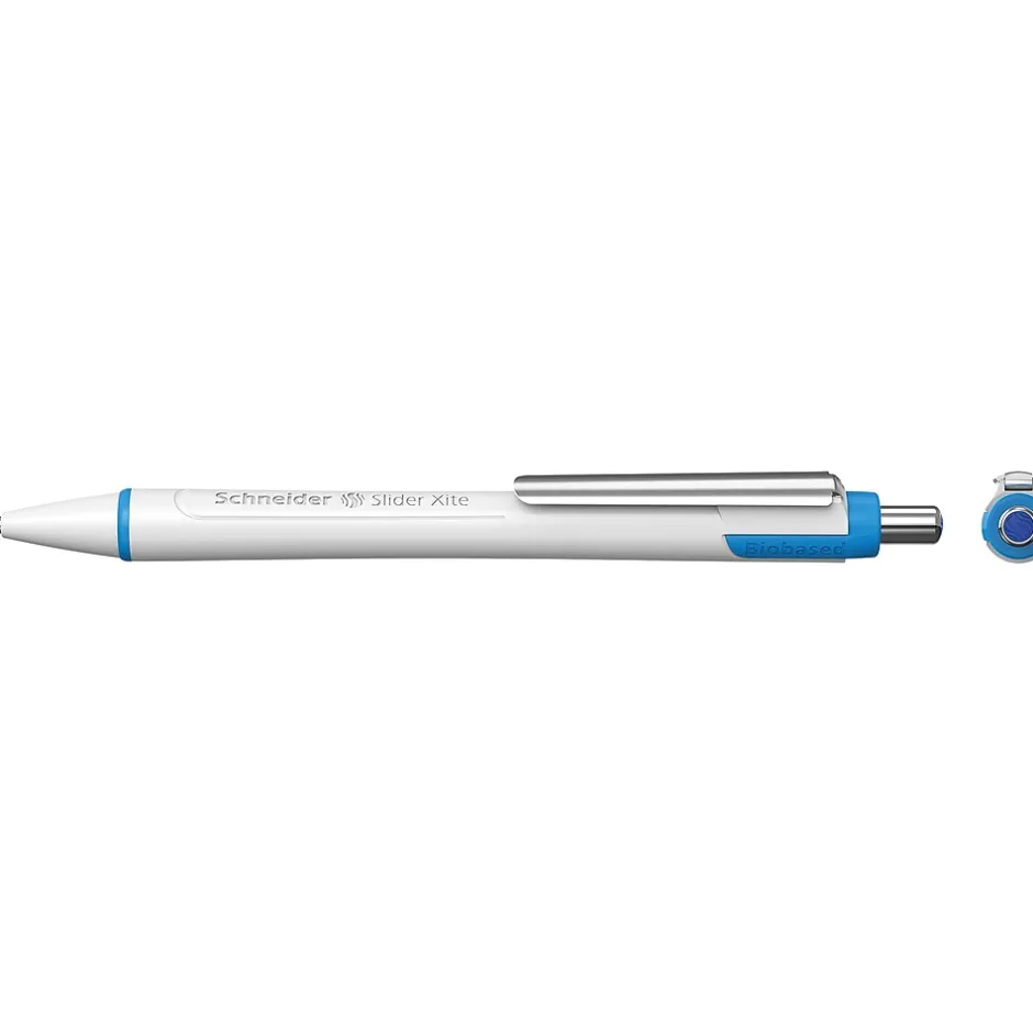 The Schneider Slider Xite XB Retractable and Refillable Ballpoint Pen features Viscoglide® technology for extraordinarily smooth, gliding writing and a barrel consisting of 90% bio-based plastics. Waterproof according to ink standard ISO 12757-2, ink dries quickly, even on smooth paper, and is smudge-proof when highlighting it later on. The wear-resistant stainless steel tip helps prevent grinding across the page and guarantees the large ink supply can be fully used without smearing. The slightly concave-shaped barrel has a sturdy metal clip and promotes tireless, relaxed writing. Compatible with the Plug+Play System, the Slider Xite can use a variety of refill formats, including the giant Slider 755 XB refill and writes with an extra broad (XB), or approximately 1.4 mm line width. The ink color is recognizable at the top of the push button. The Slider Xite is produced CO2 neutral. Includes box of ten (10) blue ink pens.