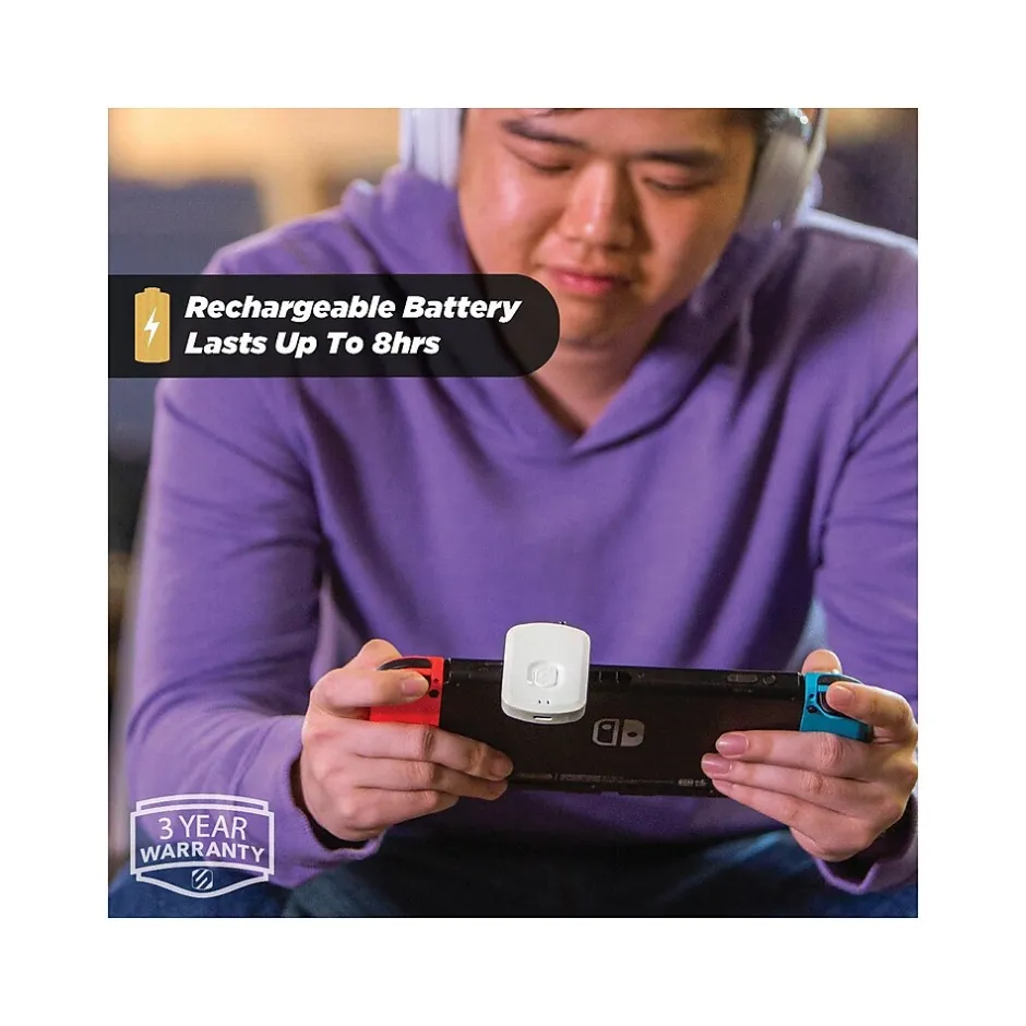 - Box contains: transmitter, 3.5mm AUX adapter cable (4″), USB Type-A to USB Type-C charging cable, storage pouch