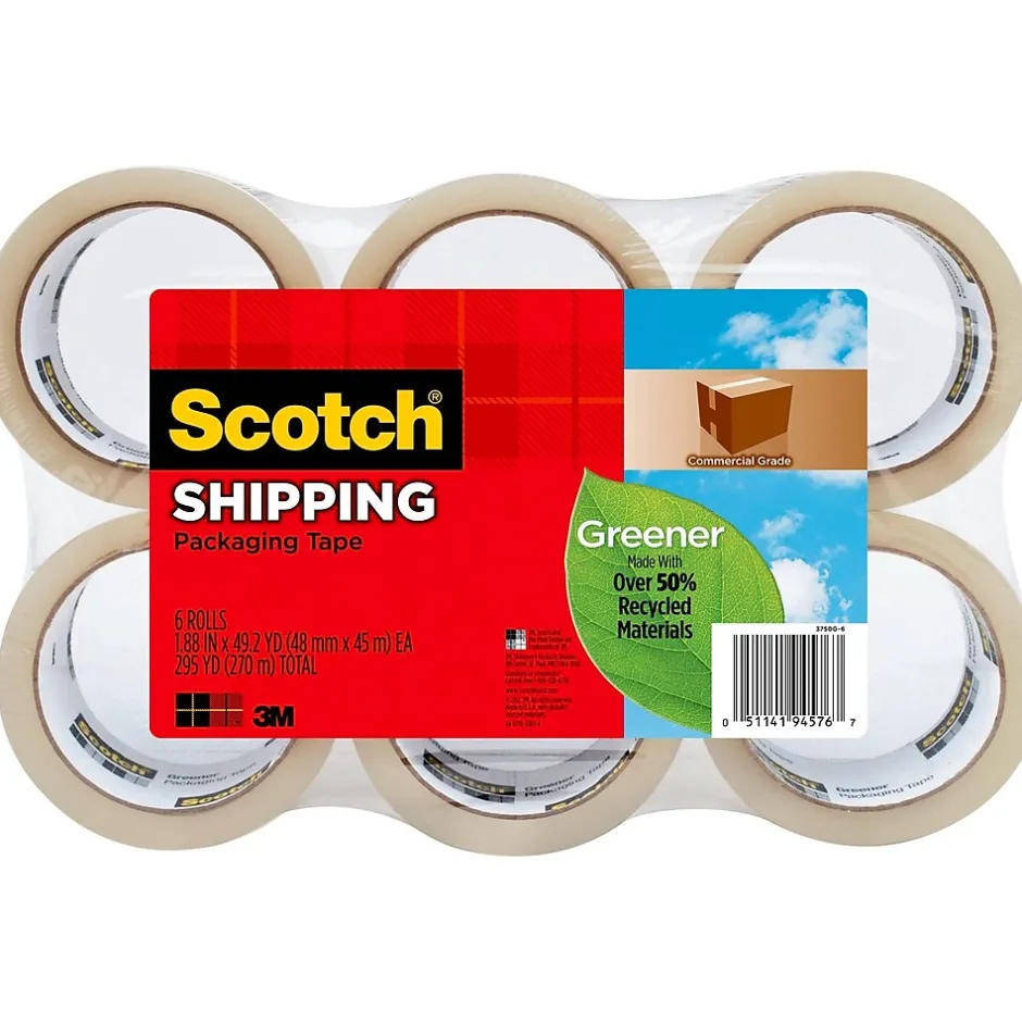 Protect what you ship-and feel good about it too: With Scotch Commercial Grade Greener Shipping Packaging Tape. This tough tape stands up to all the bumps your packages go through. It’s also made from over 50% recycled materials-so it’s strong in use and keeps the environment in mind. Designed for industrial performance-holding up to 30 lbs per inch (tensile strength)-it keeps what’s inside the box sealed securely. Instead of layers of tape, you need only one strip at a time to keep boxes closed tight-even those made of hard to stick, 100% recycled materials. Go with the packing tape that gives you Commercial Grade strength made greener – all in one.