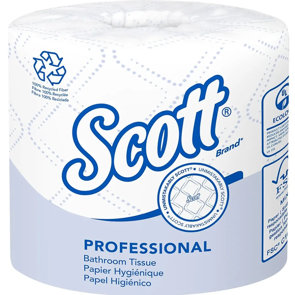 - 473 Sheets/Roll, 80 Scott® Professional 100% Recycled Fiber Standard Roll Toilet Paper Rolls/Case; 37,840 Sheets/Case; with Elevated Design; 2-Ply; White; Individually wrapped rolls