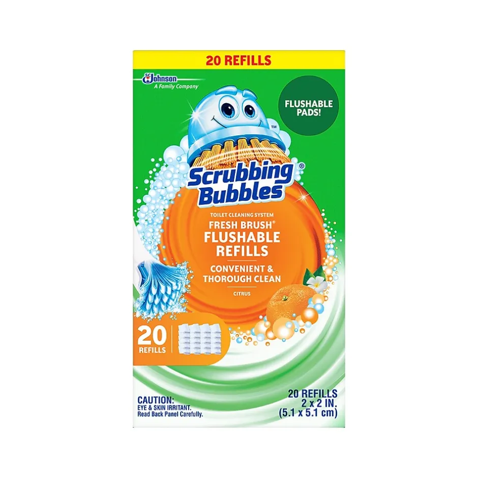 When it’s bowl season, you really need to bring your A game. That’s why Scrubby puts you in full commode mode with Scrubbing bubbles Fresh Brush toilet cleaning system refill. The only toilet bowl cleaner system with flushable pads for a convenient clean. Each kit includes a handle, four pads, and a stand. Just flush the dirty pads away. Easy-peasy cleaning! Total bowl protection and a brush you can flush? That’s cleaning reinvented.