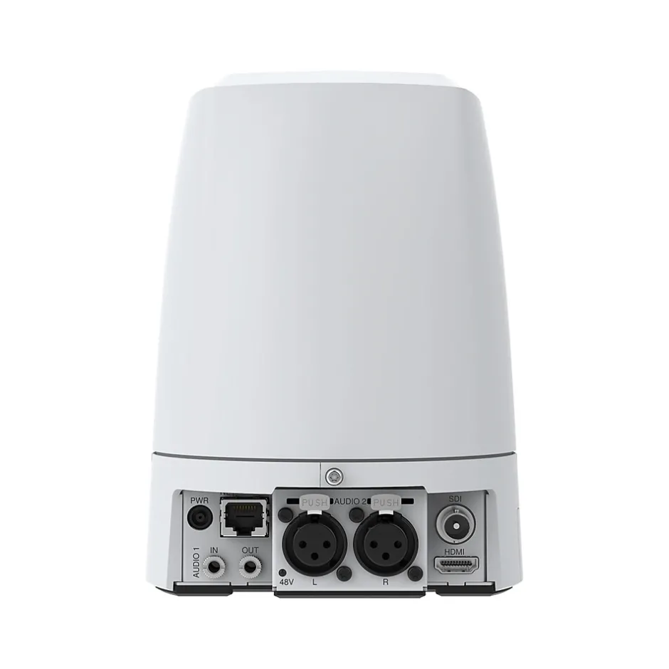 - Connectors included: RJ45 10BASE-T/100BASE-TX, terminal block for two configurable alarm input/output, 3.5 mm stereo mic/line in, 3.5 mm stereo line out, XLR-3 (left + right) mic/line in (with 48 V phantom power), HDMI Type A, BNC for SDI, DC input RS232 serial connector for VISCA