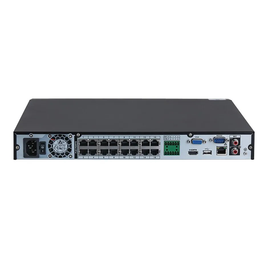 - Connectivity ports include USB, 8 PoE, LAN, RCA audio input and output, and VGA and HDMI outputs