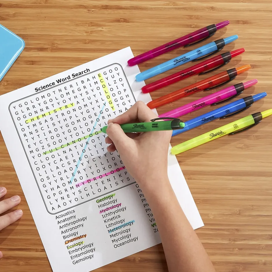 Highlight and underline memorable text with these assorted-color fluorescent highlighters. The retractable easy-push button makes one-handed highlighting simple, and the Smear Guard ink doesn’t smudge or bleed through papers. The included storage pouch lets you keep these Sharpie Accent highlighters together.