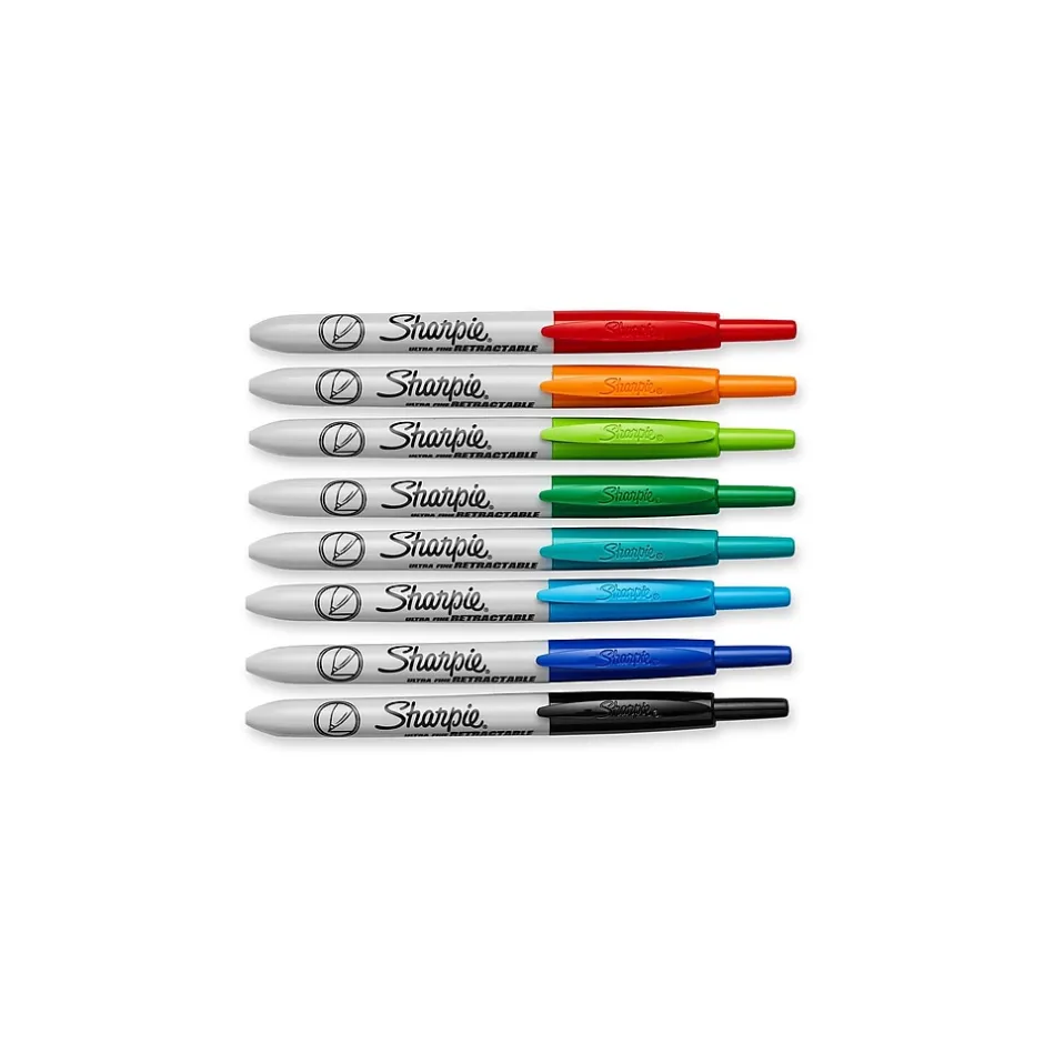 Create detailed diagrams with these Sharpie retractable permanent markers. Eight bright colors provide plenty of scope when writing on paper, plastic and metal, and the ultra-fine points let you inscribe fade-resistant messages on sticky notes to grab attention. Simple, one-handed operation makes them easy to use, and the pocket-clip design provides excellent portability. Sharpie retractable permanent marker ink is quick drying and water-resistant to prevent smudging, and the ink is AP-certified as nontoxic.