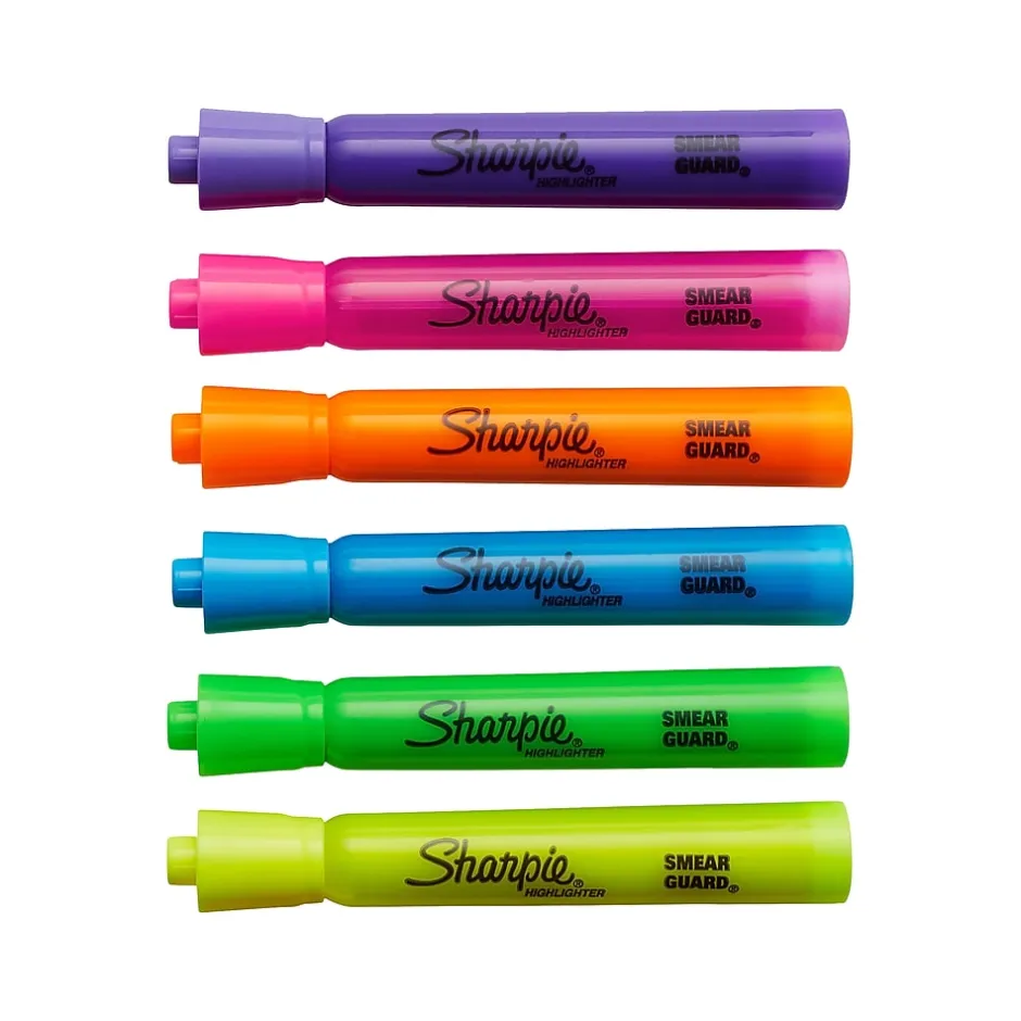Enjoy reliable, long-lasting marking with Sharpie tank highlighters. Featuring a wide barrel, large ink supply, and chisel tip, these highlighters deliver dependable and accurate marks. They also have SmearGuard ink technology that resists smearing (let ink dry before highlighting).