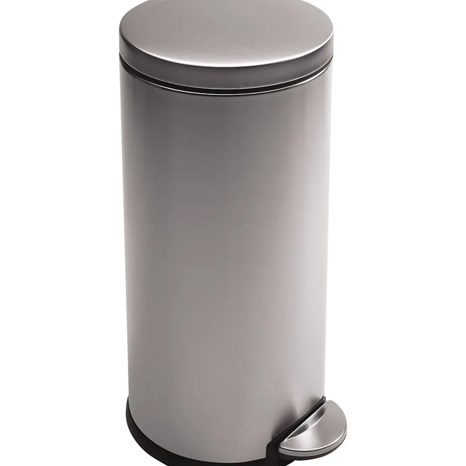 simplehuman® Round step trash can has strong steel pedal for an easy access and is designed for superior durability. Can of 8 gal capacity has lid shox technology that ensures slow/silent close and fingerprint proof that resists smudges.