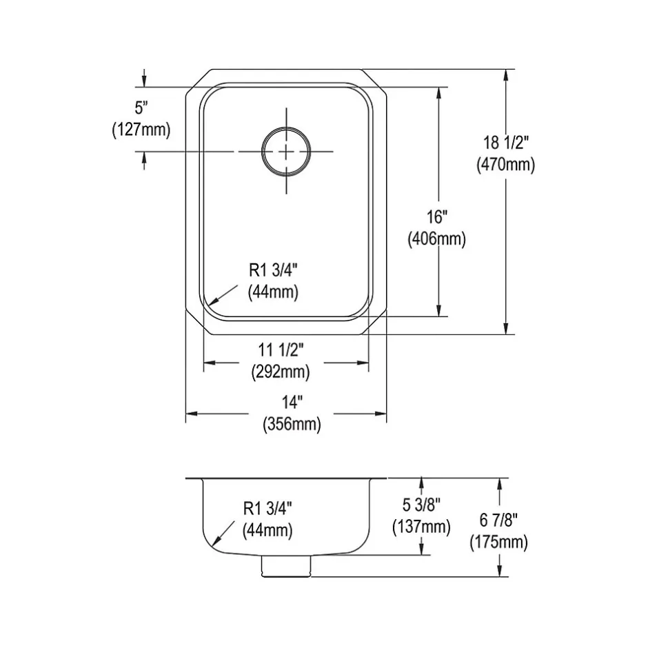 - Overall dimensions: 18.5″H x 14″W x 6.88″D; bowl dimensions: 16″H x 11.5″W x 5.38″D; sink drain opening measures 3.38″Dia.