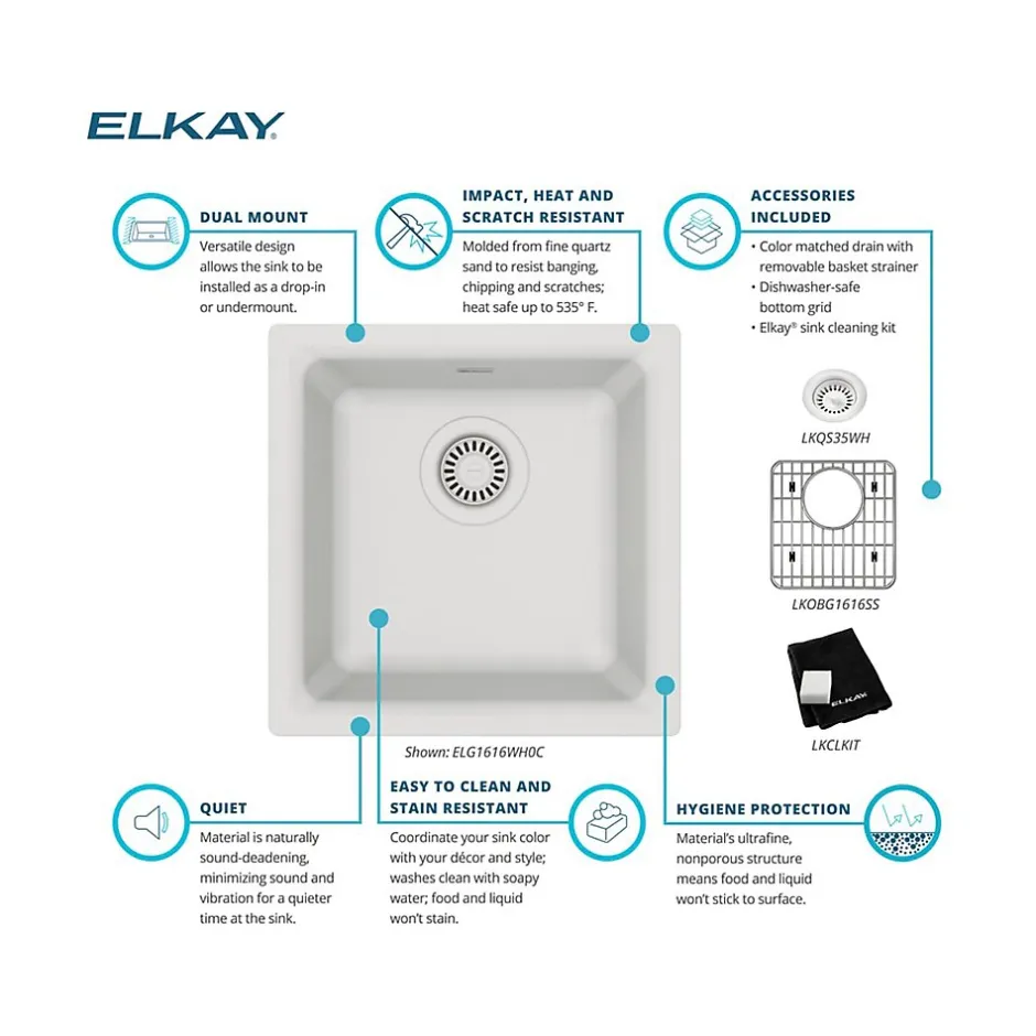 The Elkay Quartz Classic sink has a smooth surface and a visible depth to its structure. Crafted from natural quartz, the sink comes in a UV-stable white finish to add an unexpected pop of color to your space. Whether it’s a kitchen sink or a prep, bar, or laundry sink, this composite sink has the durability you need to take on tough tasks.