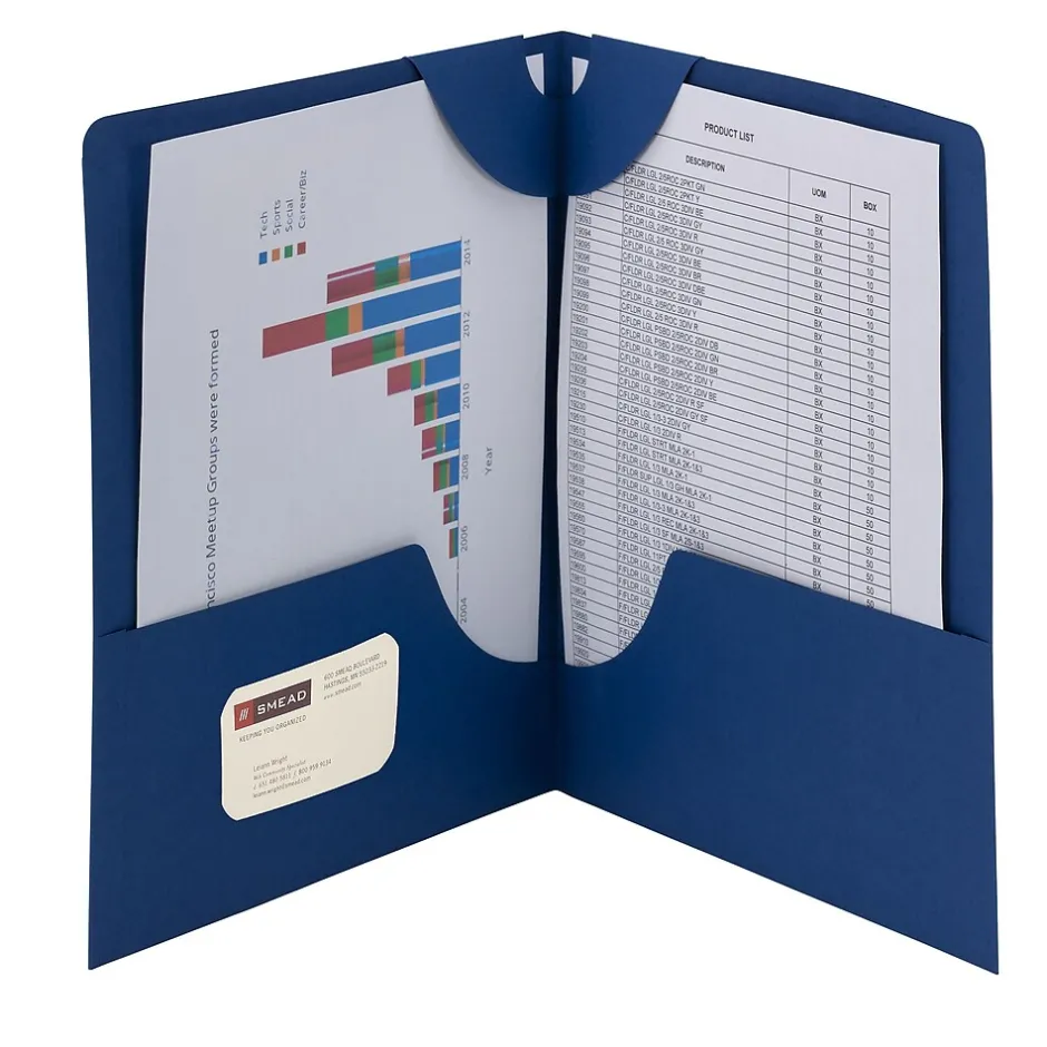 Combine accessibility and volume with these two-pocket portfolios that can hold up to 50 pages. The fold-over tabs feature at the top prevents documents from falling out no matter what direction the folder is turned. These Smead Lockit two-pocket portfolios have a convenient business card slot on the left pocket to make your contact information readily available.