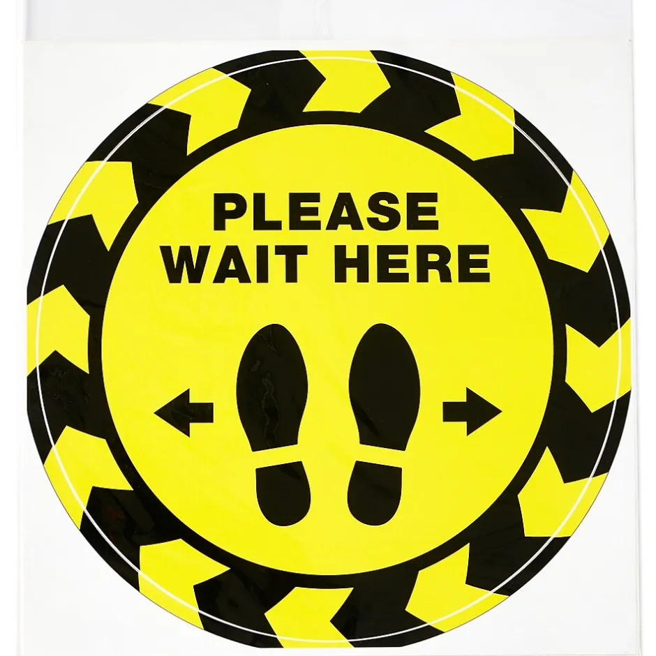 Keep people at a safe distance with round Avery “Please Wait Here” social distancing floor decals. Preprinted with an eye-catching yellow and black pattern and a semi-glossy finish, these large round “Please Wait Here” floor decals have a 10.5″ diameter and immediately stand out. Built to withstand the constant wear and tear of everyday foot traffic, these anti-slip vinyl floor decals are scuff resistant, water resistant and UV-coated for additional durability. Removable floor decals stick and stay to multiple indoor surfaces but also peel away cleanly. The removable adhesive also makes it easy to reposition the floor decals so that you can carefully adjust the placement of the vinyl floor decals to make sure that the spacing is just right. Preprinted social distancing floor decals are perfect for every type of location or business including retail stores, restaurants, hair salons, banks, airports and more. Includes 5 preprinted removable vinyl decals.