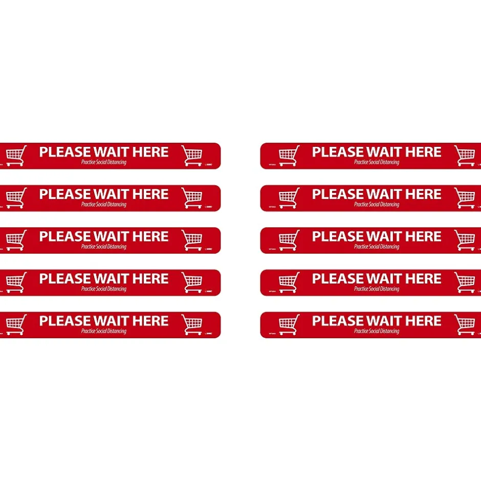 - Floor sign with the “Please Wait Here. Practice social distancing” message