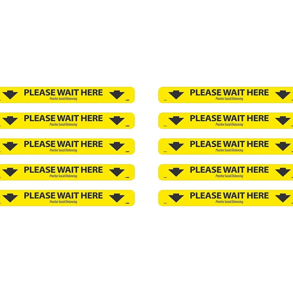 - Floor sign with “Please Wait Here. Practice Social Distancing” message imprinted in English