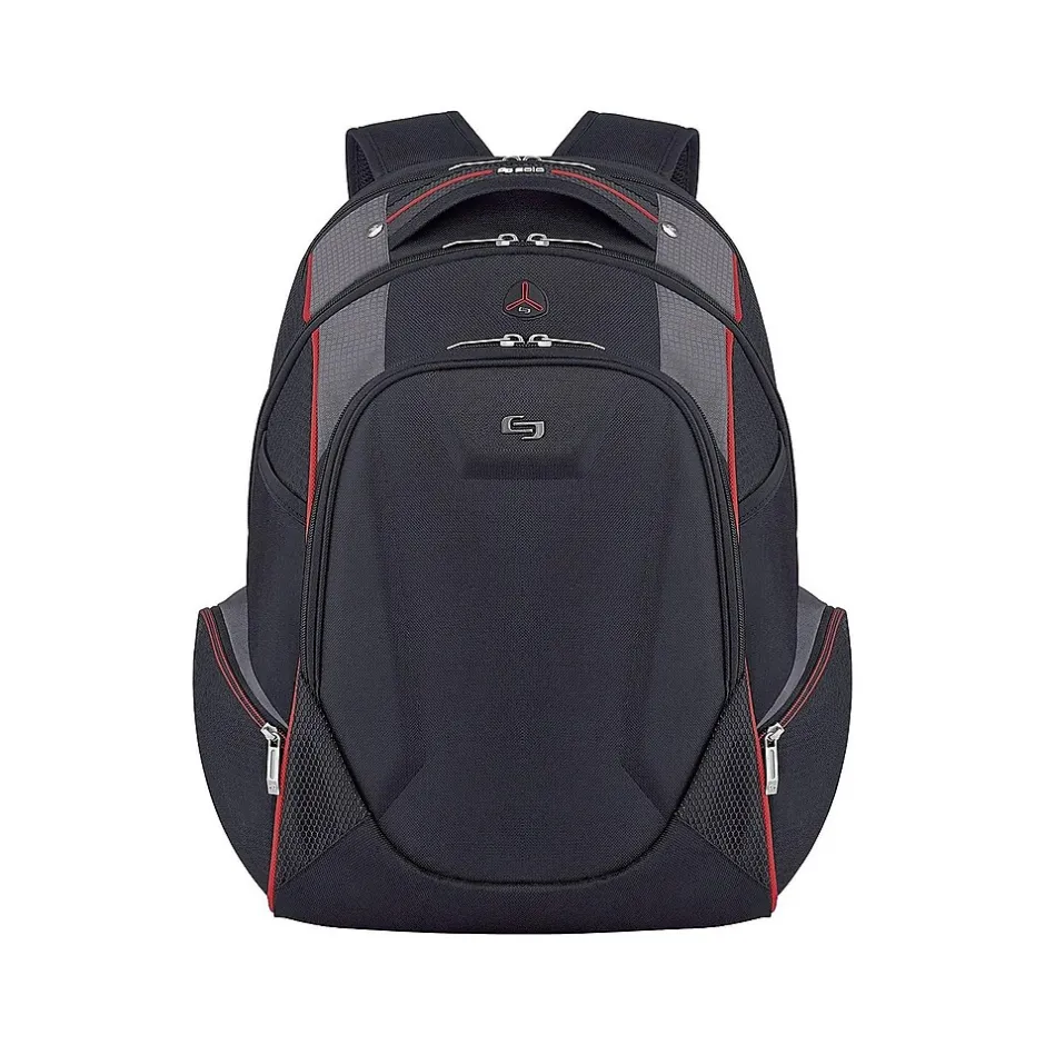 Give your personal electronics durable protection when you pack them inside this black and red backpack. A fully padded 17.3-inch laptop compartment shields your device against accidental bumps, while the dedicated pocket offers a perfect place to stash your tablet. A handy headphone port makes it easy to stay connected during phone calls or listen to favorite playlists. This laptop boasts zippered side pockets to accommodate small items or water bottles. The hardshell zip-down organizer keeps smartphones and other small devices safe from damage. Featuring a padded back and cushioned straps, this Solo New York Force Launch backpack provides added comfort as you journey to and from school or work each day.