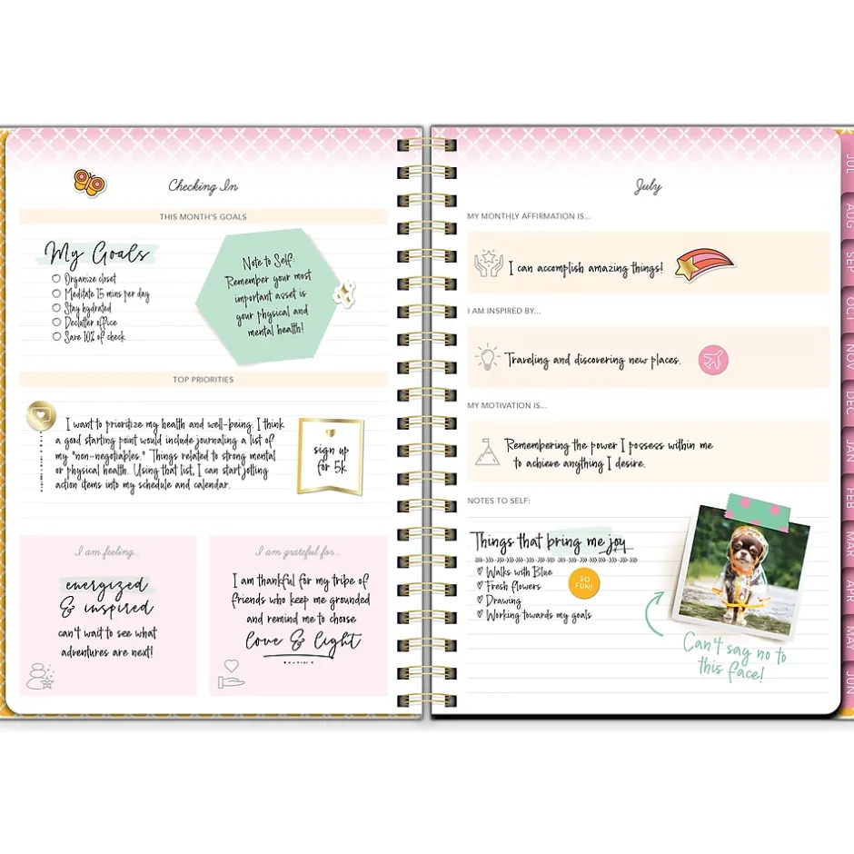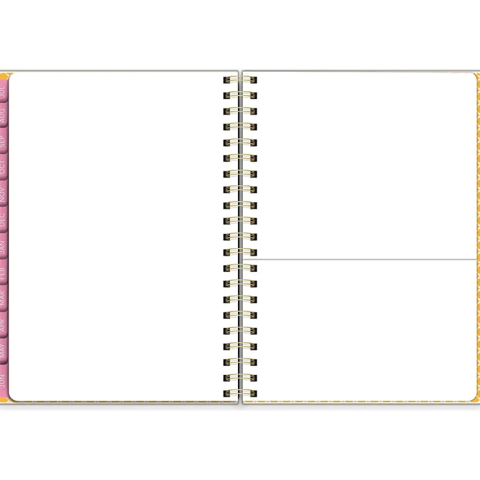 With check-in spreads and foil-enhanced stickers, this Southworth Rustic Citrus academic year planner will help you keep your personal life and school life organized. From July 2024 to June 2025, the monthly and vertical column weekly spreads allow for ample space to capture important dates and reminders. The check-in spreads provide a dedicated space to track monthly goals, thoughts, and dreams. Inside, you will find a yearly overview for a quick way to remember holidays and special events, and a storage pocket to secure loose papers and accessories. Don’t forget about the 100 foiled and fun stickers. Southworth’s durable cover and retro design coordinate beautifully with the elastic closure and metal accents to hold the pages in place. Note goals and events so that nothing important is ever missed. Every day is notable.