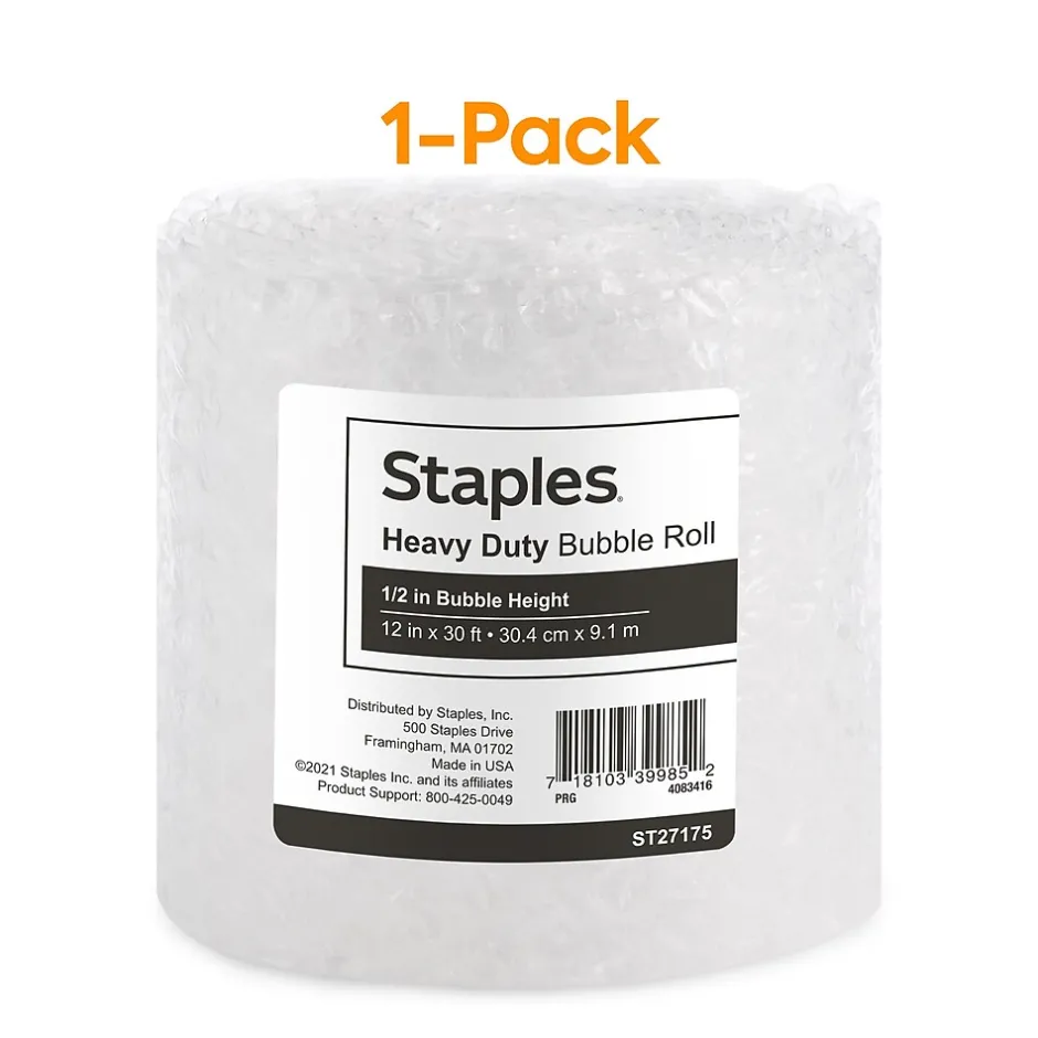 Use this bubble roll to protect fragile items during shipment. The perforated design lets to tear off the bubble wrap in 12-inch sections to produce just the right amount of wrap for each individual item. The 1/2-inch-thick design of the Staples bubble roll allows you to wrap large or small items with ease to create a compact barrier so multiple items can fit into one box if needed.