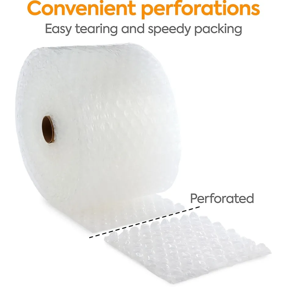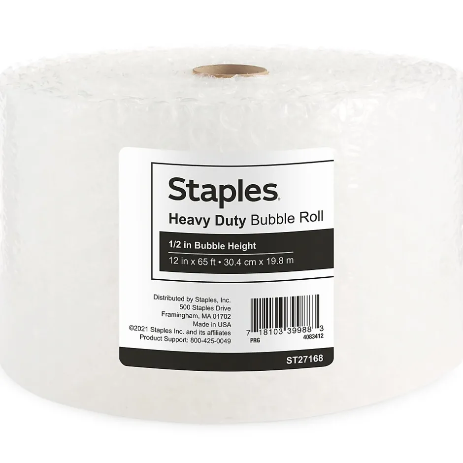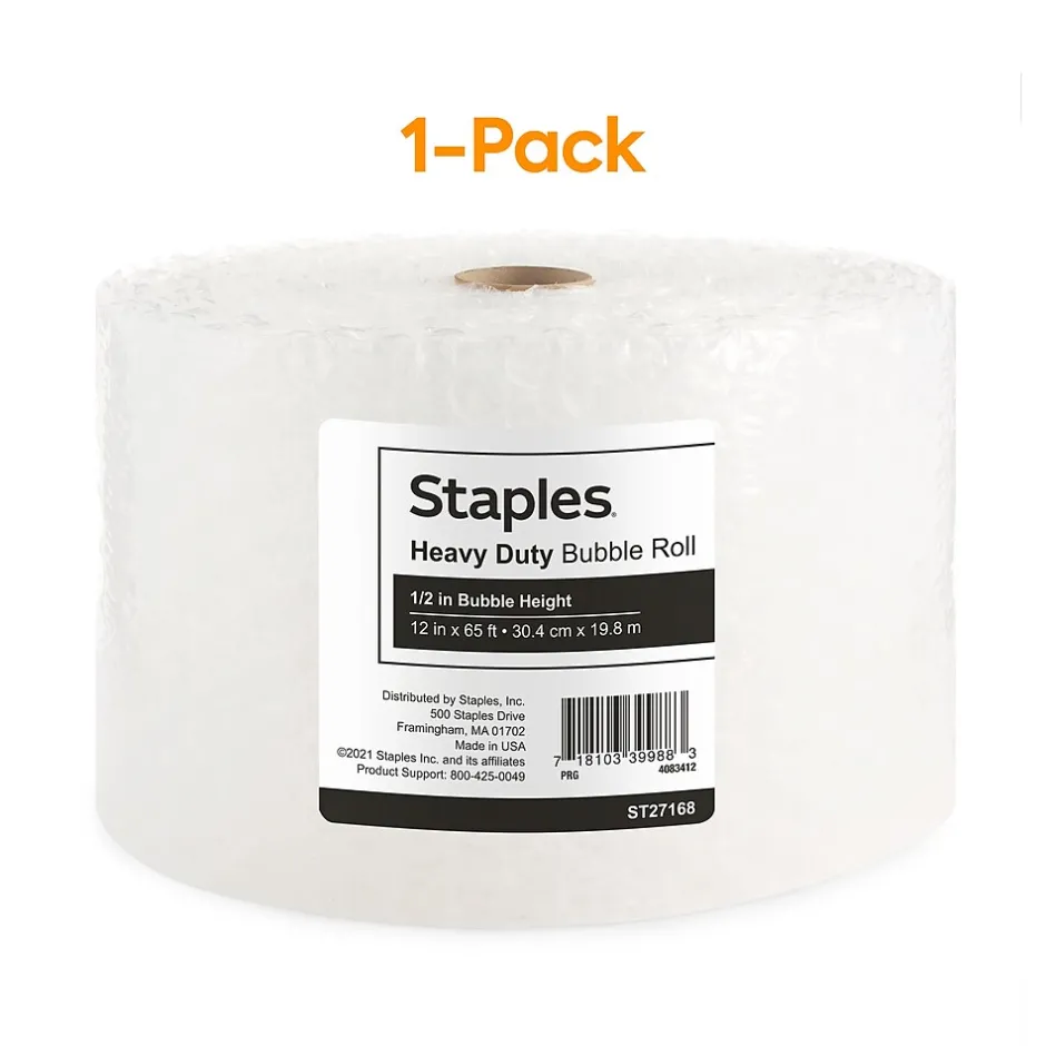 Seal delicate goods to be stocked or shipped with this heavy-duty bubble roll. Its 1/2-inch-thick bubble cushioning is strong and pop-resistant to help protect breakable items from impact during transit. This Staples bubble wrap roll measures 12 inches wide and 65 feet long and is perforated every 12 inches for easy tearing.