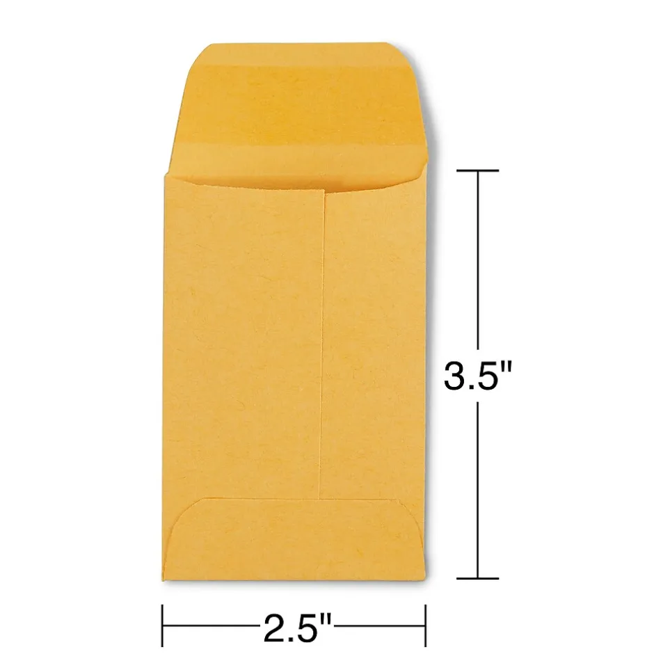 Protect small items from getting lost or damaged with these brown kraft gummed-closure coin envelopes. The gummed-closure design of these coin envelopes let you apply moisture for a strong seal, while the compact size makes them ideal for storing keys, coins or other small objects. These Staples kraft gummed-closure coin envelopes are made with sturdy 28-pound kraft paper for durability.