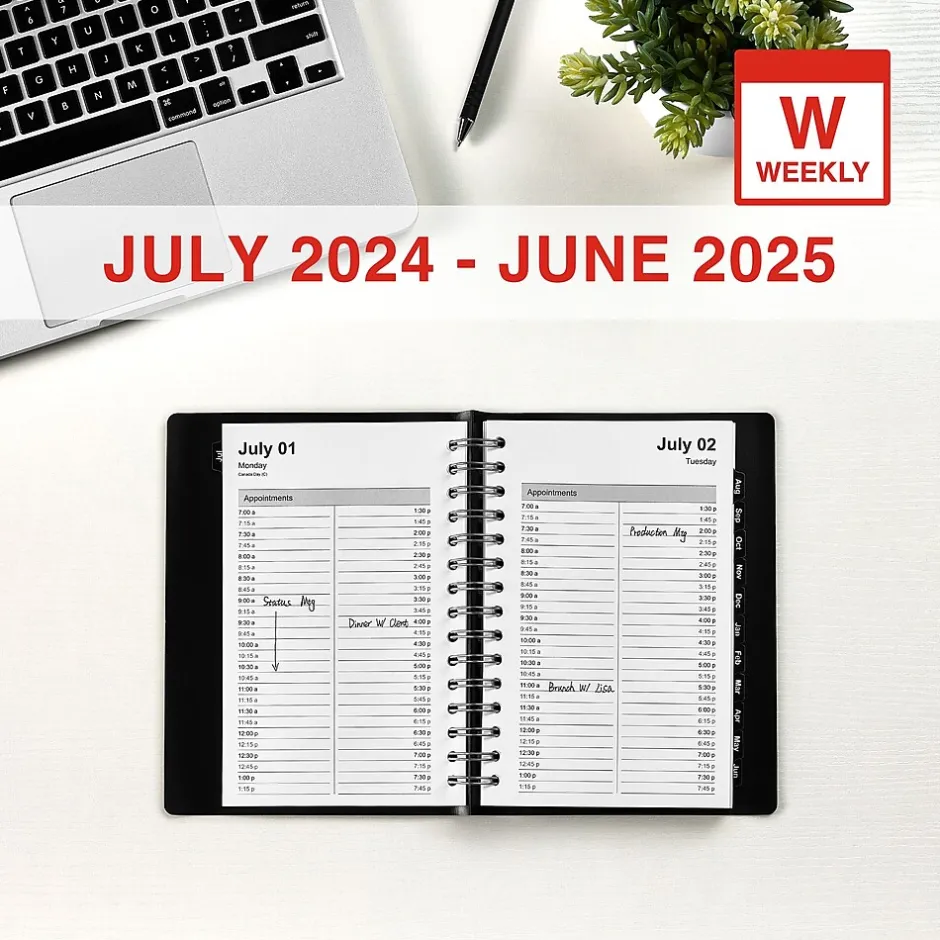 Plan your day in detail with this daily appointment book. The spiral twin-loop wire binding makes it easy to flip through the pages, while the black leatherette cover with a silver logo lends a professional look. This Staples 5 x 8-inch 2024-2025 daily appointment book features appointment pages with 15-minute intervals so you can track important events.
