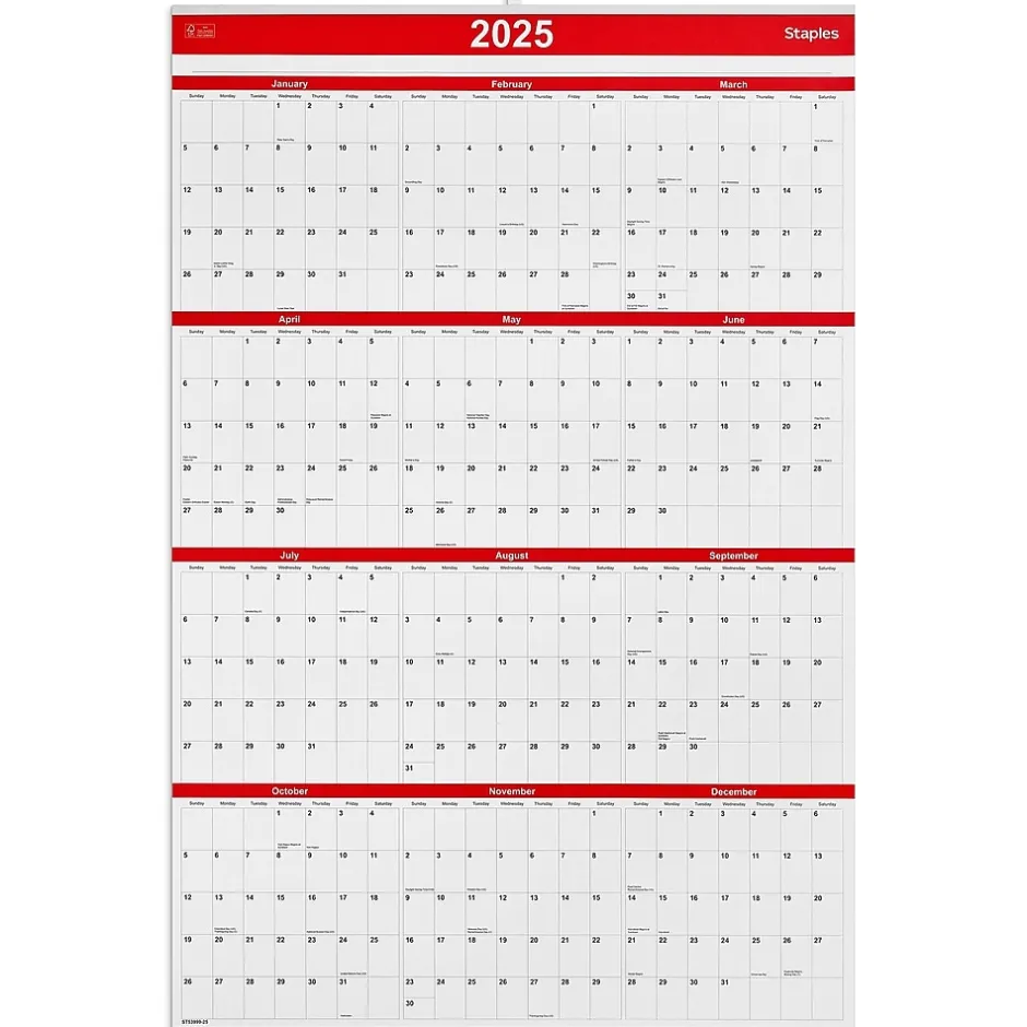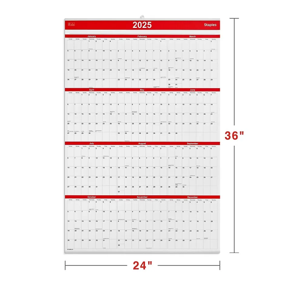 Coordinate your plans seamlessly with this 2025 vertical wall calendar. The paper material provides a smooth writing surface, while the large blocks offer ample space to create reminders. This Staples 24 x 36-inch 2025 vertical wall calendar features contrasting colors for easy visibility from a distance and a hook-and-loop closure for quick hanging.