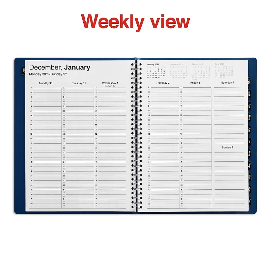 Organize your workday with this 2025 weekly appointment book. The leatherette cover protects against dust and damage, while the 14-month format helps you manage appointment times. This Staples 8 x 11-inch navy weekly appointment book features a spiral binding to make flipping through pages easy and a compact size for convenient storage in your desk or briefcase.