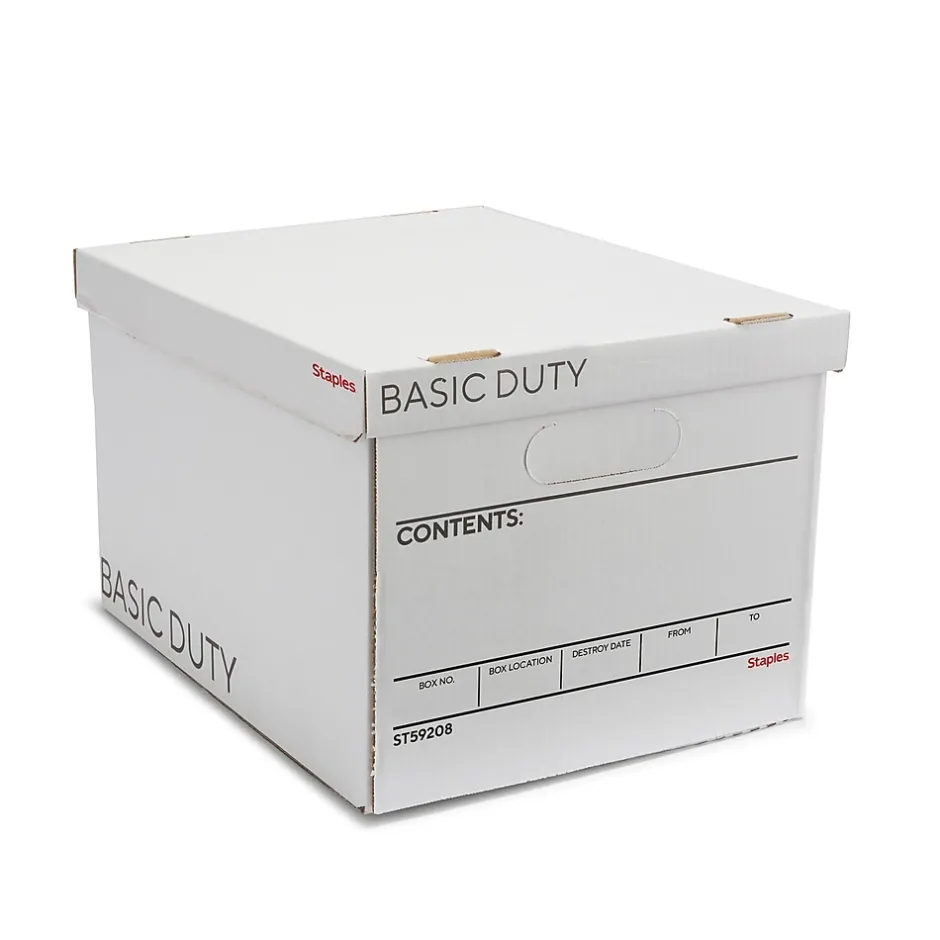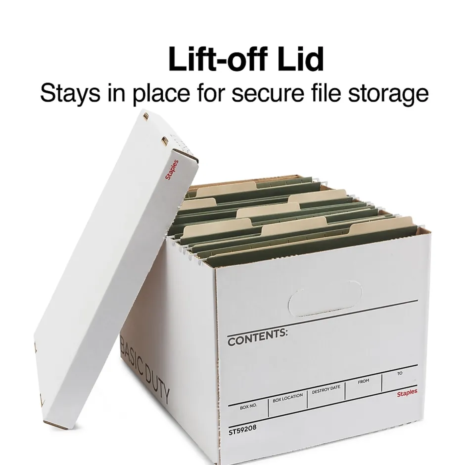 Contain bulk office files with this 10-count pack of corrugated storage boxes. A preprinted write-in area allows labeling for quick identification, while the lift-off lid offers access to stored letter-size and legal-size documents. With a stacking strength of 350 pounds, these boxes withstand piling. These Staples basic-duty corrugated storage boxes have easy-grip handles for enhanced portability.