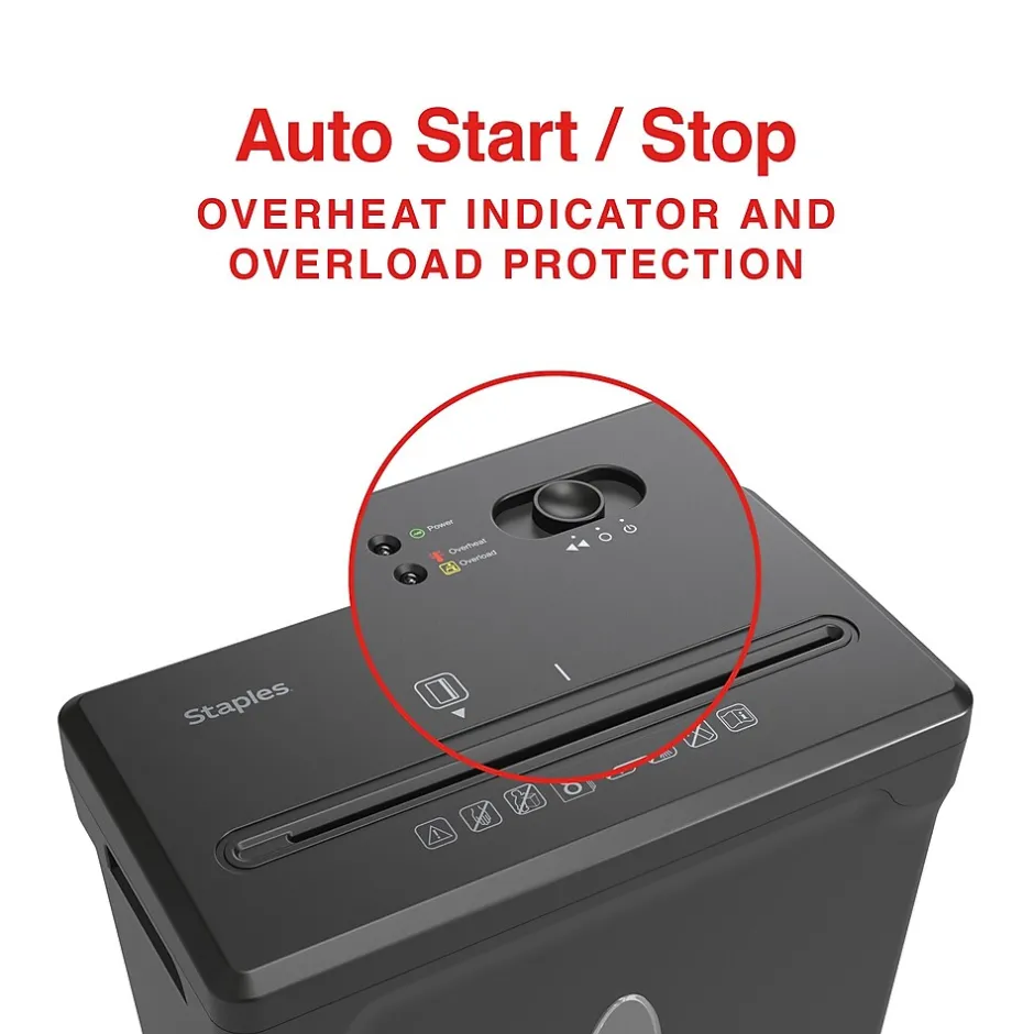 This easy-to-empty Staples Cross-Cut Shredder features powerful blades to keep your disposed documents safe. With a P3 security level rating designed for day-to-day personal paperwork and emails, this unit takes your data down to 5mm x 40mm pieces. The Staples 8-Sheet Cross-Cut Paper Shredder can shred paper, credit cards, and staples for home and office use. Safety temperature indicators and manual reverse loading prevent jams and overheating so you can shred documents without wasting time.