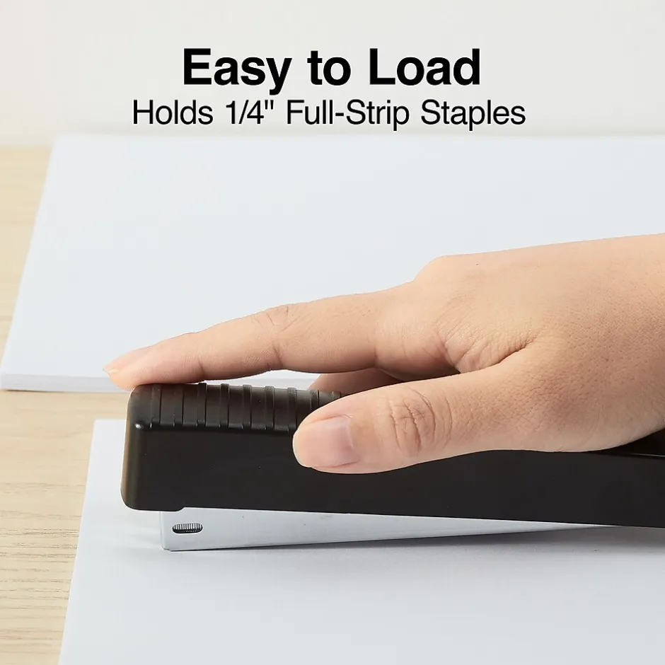 Hold papers with this desktop stapler. With a nonskid metal base, this stapler stays firmly in place, making it easier to operate, and the stapler is easy to open, so refilling is fast. This Staples stapler has a capacity of 20 sheets, so it’s a simple job to bind together large reports, articles, and other documents, while the smooth black plastic material provides a professional appearance.