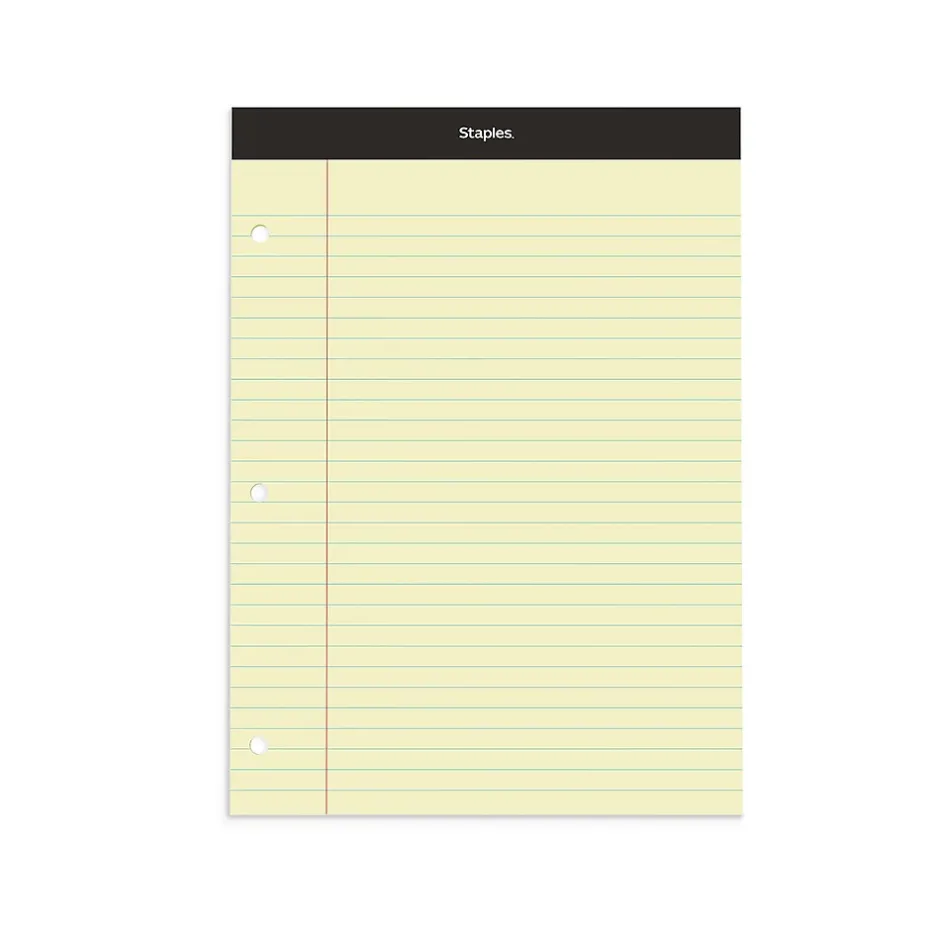 Make sure notes are easy to read when you use this canary double-sheet notepad. Each sheet employs wide-ruled spacing that lets you use large, clear lettering, while the canary coloring ensures writing stands out for high readability. This Staples wide-ruled canary double-sheet notepad has double the sheets of regular notepads to meet hefty note-taking needs, and the three-hole punched edges work with standard three-ring binders.