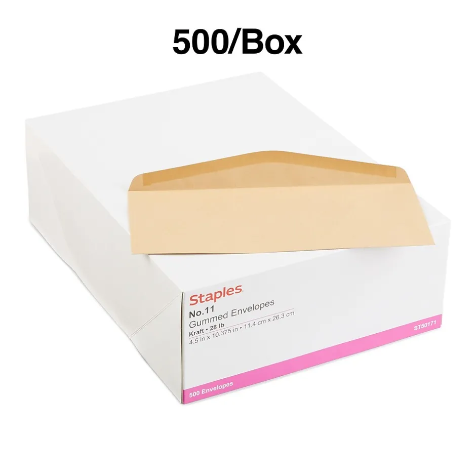 Send letters, brochures, and checks with these #11 brown envelopes. Each envelope has a commercial flap with moistenable glue for enhanced security, while the heavy-duty 28-pound kraft paper provides increased strength and durability, so the contents arrive exactly as intended. These Staples gummed envelopes are made from at least 20 percent post-consumer content and come in a pack of 500, letting you easily stock up.