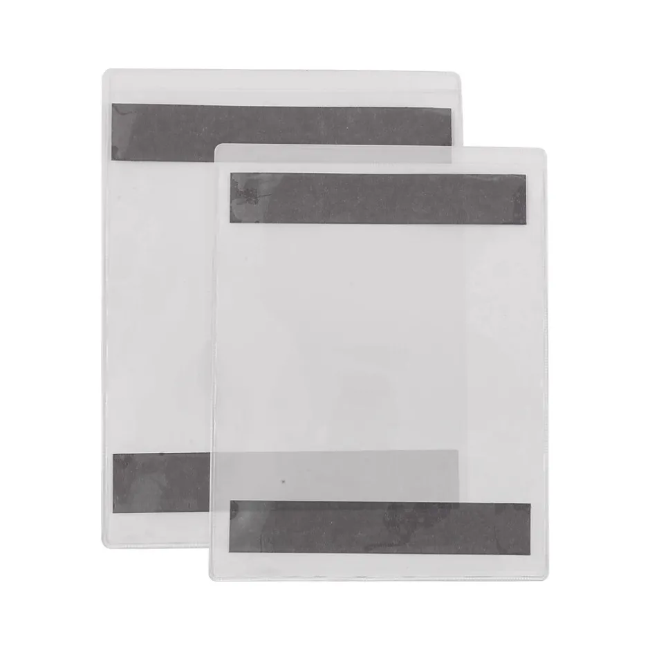 Preserve warnings, product orders, and other documents in work environments with this 15-count pack of job ticket holders. The thick, clear poly protects interior contents from moisture or dirt while text and images remain visible. Top-loading insertion with three enclosed sides lets you quickly add and remove paperwork or signage. Magnetic strips on these Staples job tickets enable secure placement on any metal surface.