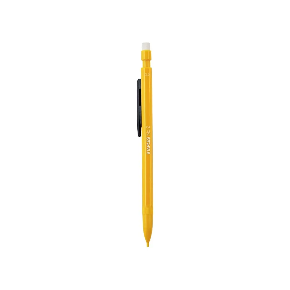 Calculate and correct mistakes with these Staples 0.5mm yellow-barrel mechanical pencils. Each pencil has a hexagonal shape to provide enhanced control while keeping them from rolling off your desk, and the smudge-resistant rubber eraser allows you to make clean corrections on the fly. These Staples 0.5mm yellow-barrel mechanical pencils have a retractable tip to prevent lead from breaking off in your pocket or bag.