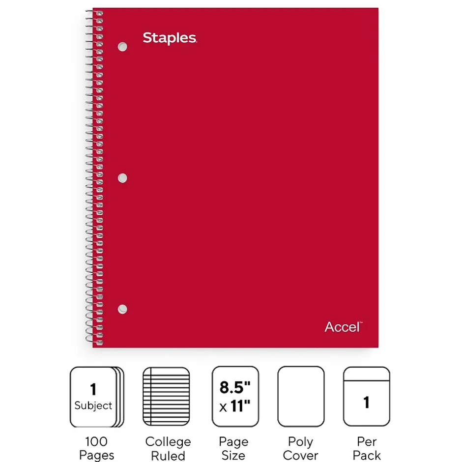 Replenish your paper supplies with this red premium poly 1-subject notebook. Featuring a strong coil, this notebook lets you flip through pages easily, and the perforated sheets tear out simply and evenly when needed. This Staples Premium 8.5 x 11-inch red poly 1-subject notebook has 100 college-ruled sheets to make the most of each page.