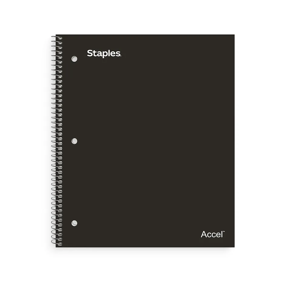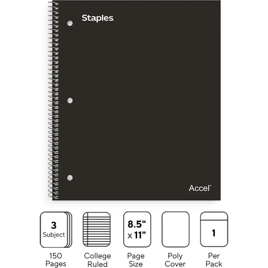 Store loose documents and notes in the pocket dividers in this 3-subject notebook. The college-ruled design makes it easy to have numerous entries per page, while the perforated sheets can be cleanly removed and shared without tearing. Boasting a spiral spine design, this Staples Premium 8.5″ x 11″ black 3-subject notebook lets you effortlessly flip through previously written notes or ideas, and the premium paper delivers durability.