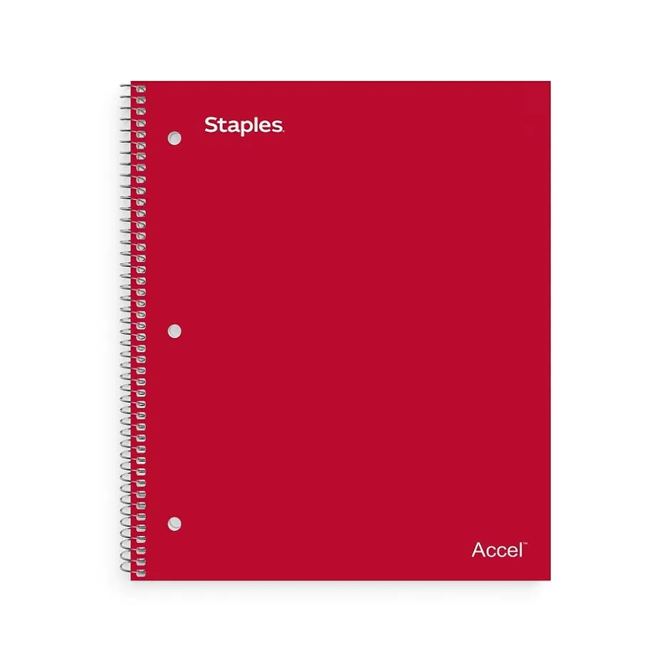 Organize your thoughts and ideas in this 3-subject notebook. The spiral spine lets you turn pages smoothly without snagging, while the perforated pages ensure easy sheet removal. Featuring 150 sheets of college-ruled paper, this Staples Premium 8.5″ x 11″ red 3-subject notebook makes the most of your writing space, and the poly cover prevents damage for durability and page protection.