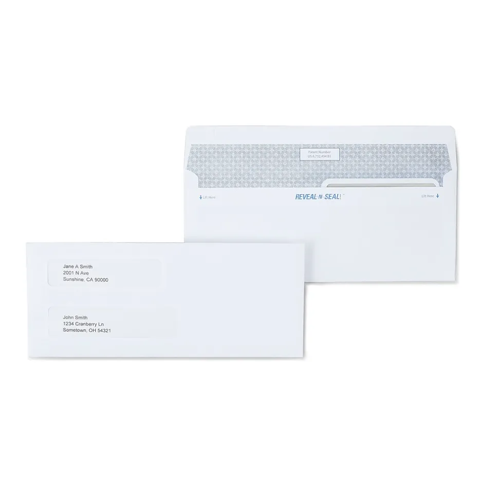 Staples Reveal-N-Seal 67539S #8 white double window envelope measuring 3 5/8″ x 8 5/8″, features strong, tamper-evident seal to protect confidential documents. It has small perforations along the flaps for tampering. This security-tinted envelope offers self-sealing closure that requires no moisture to seal.