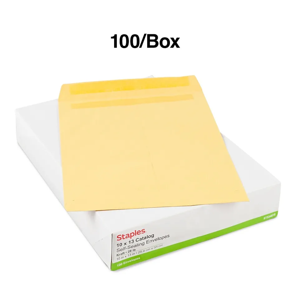 Ship magazines and documents securely with these self-sealing catalog envelopes. Each envelope has a self-sealing design that doesn’t require moisture, so you can seal contents safely simply by pressing together the gummed strips. These Staples self-sealing catalog envelopes are constructed with 28-pound kraft paper, so they’re thick enough to prevent papers from getting damaged or bent while being shipped.
