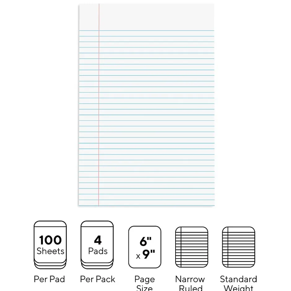 These writing tablets measure 6″ x 9″ and each have 100 narrow ruled sheets. They also come in four colors: green, blue, black and red.