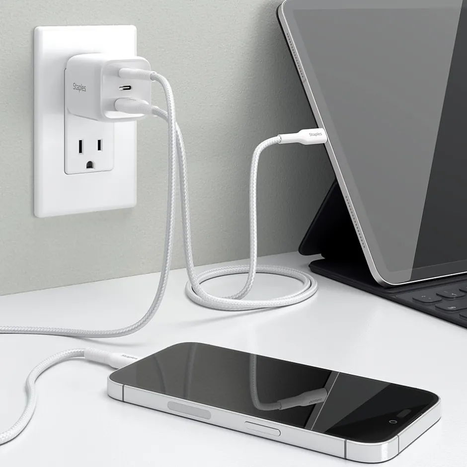 Great for a central charging station at the office or at home, this compact and powerful hub can charge three devices at once using two USB-C and one USB-A ports. This StaplesĀ® Three-Port USB-A & USB-C Wall Charger features innovative GaN technology to fully charge smartphones and tablets faster than standard chargers without the risk of overheating. Take this 65W charging dock anywhere with a foldable and ultra-portable wall plug. With the included 6.5ft long, durable braided 2.0 USB-C to USB-C cable, you can get extra reach and get your devicesā batteries back to 100%.