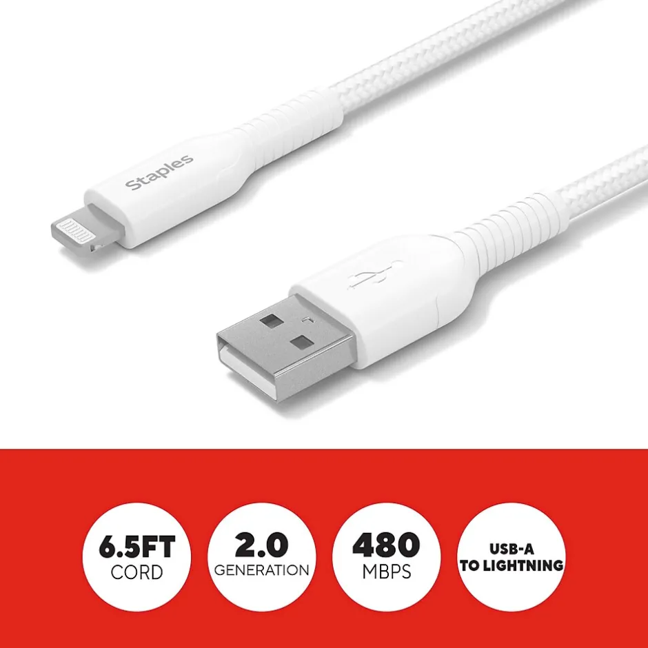 Power your Apple devices (Generation 14 and earlier) with this lasting StaplesĀ® USB-A to Lightning Braided Cable. The unique braided design provides extra durability, prevents tangles and has been tested to withstand up to five-thousandbends. A 6.5ft (2m) cable length gives extra reach when needed and is perfect for comfortably using devices while they charge.