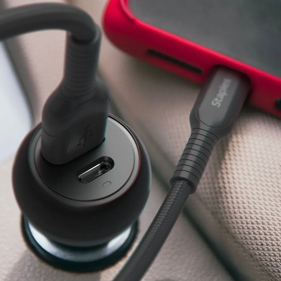 Perfect for commuters or workers on the go, this dual-port car charger features one USB-A and one USB-C port to charge two devices at once. Plug this Staples® Two-Port USB-A & USB-C Car Charger into your car’s auxiliary power outlet to power your smartphones and tablets quickly.
