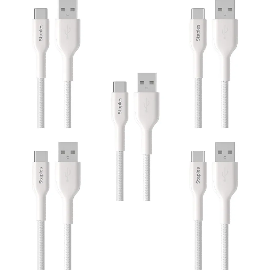 Power your smartphones and tablets with this durable StaplesĀ® USB-C to USB-A Braided Cable. The unique braided design provides extra durability, prevents tangles and has been tested to withstand up to five-thousand bends. A 6.5ft (2m) cable length gives extra reach when needed and is perfect for comfortably using devices while they charge.