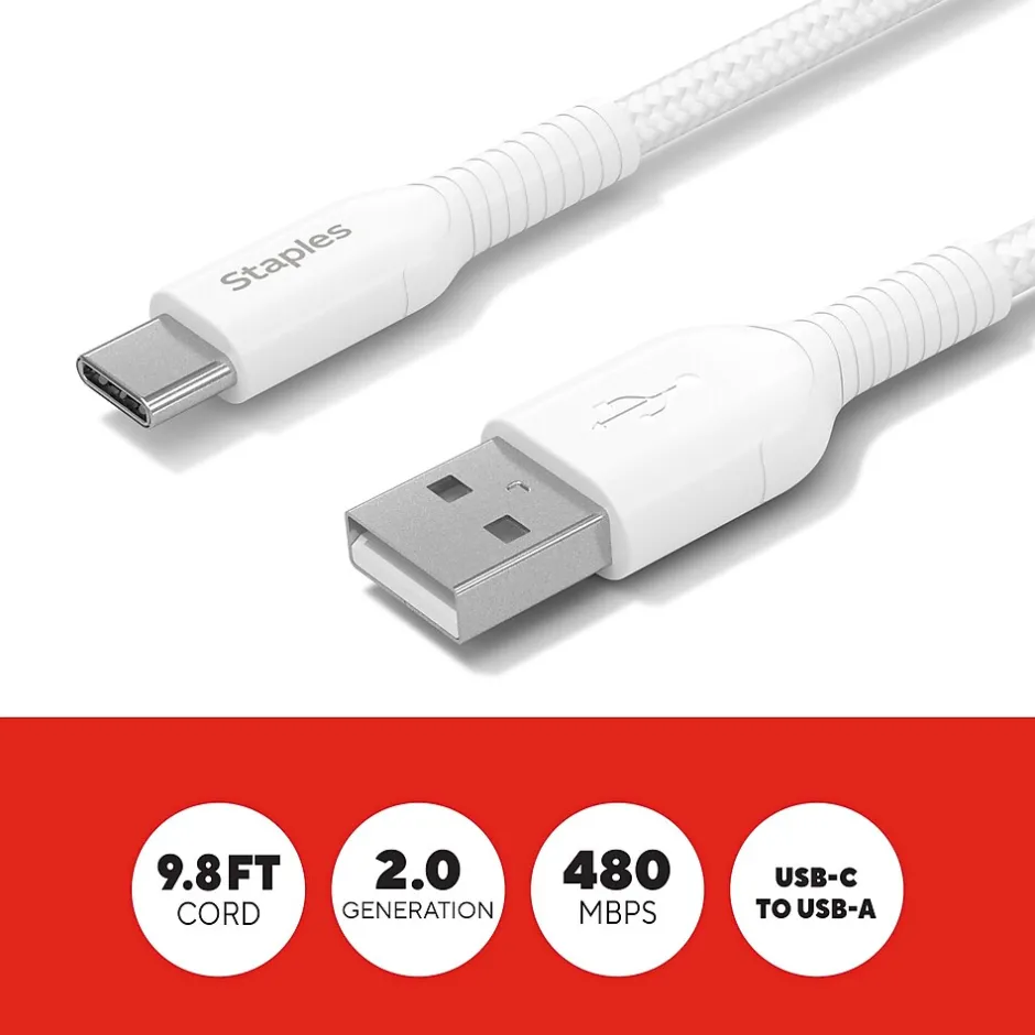 Power your smartphones and tablets with this lasting Generation 2.0 USB StaplesĀ® USB-C to USB-A Braided Cable. The unique braided design of this charging cable provides extra durability, prevents tangles and has been tested to withstand up to five-thousand bends. A 9.8ft cable length gives you extra reach when charging your devices.