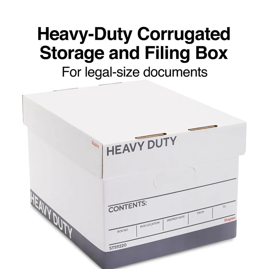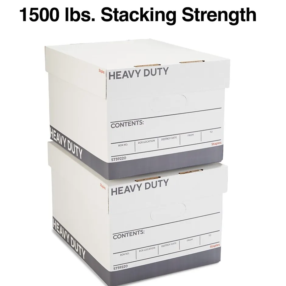 Maintain a clutter-free office space with these storage boxes. The easy-grip handles make carrying simple, while the lift-off lid helps keep stored letter-size and legal-size documents secure. With a 1500-pound stacking strength, the boxes support piling for an optimized work area. These Staples heavy-duty corrugated storage boxes are easy to set up for hassle-free filing and have preprinted write-in areas for effortless identification.