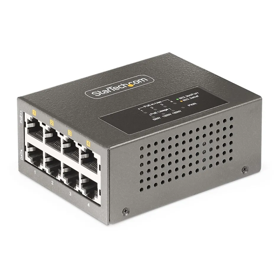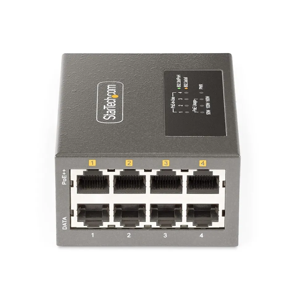 This 4-Port Multi-Gigabit PoE++ Injector Hub serves as Power Sourcing Equipment (PSE) and enables multigigabit speeds of 5Gbps, 2.5Gbps, 1Gbps, 100Mbps, and 10Mbps across four Ethernet ports. This mid/end-span injector is capable of transmitting network data and power up to 328ft (100m) for remote installations. The PoE, PoE+, PoE++ compatibility and selectable power output ensure seamless compatibility with Powered Devices (PD). The TAA-compliant injector includes a Universal Power Adapter for different regions. Multiport PoE Injector supports the IEEE 802.3af, 802.3at, and 802.3bt (Type 3 and Type 4) standards for Power Sourcing Equipment (PSE), delivering up to 52V DC and 95Watts. This flexibility eliminates the need for a separate power source for remote networked devices such as IP cameras, access control devices, remote kiosks (POSs), wireless access points, PoE lighting, and digital signage.