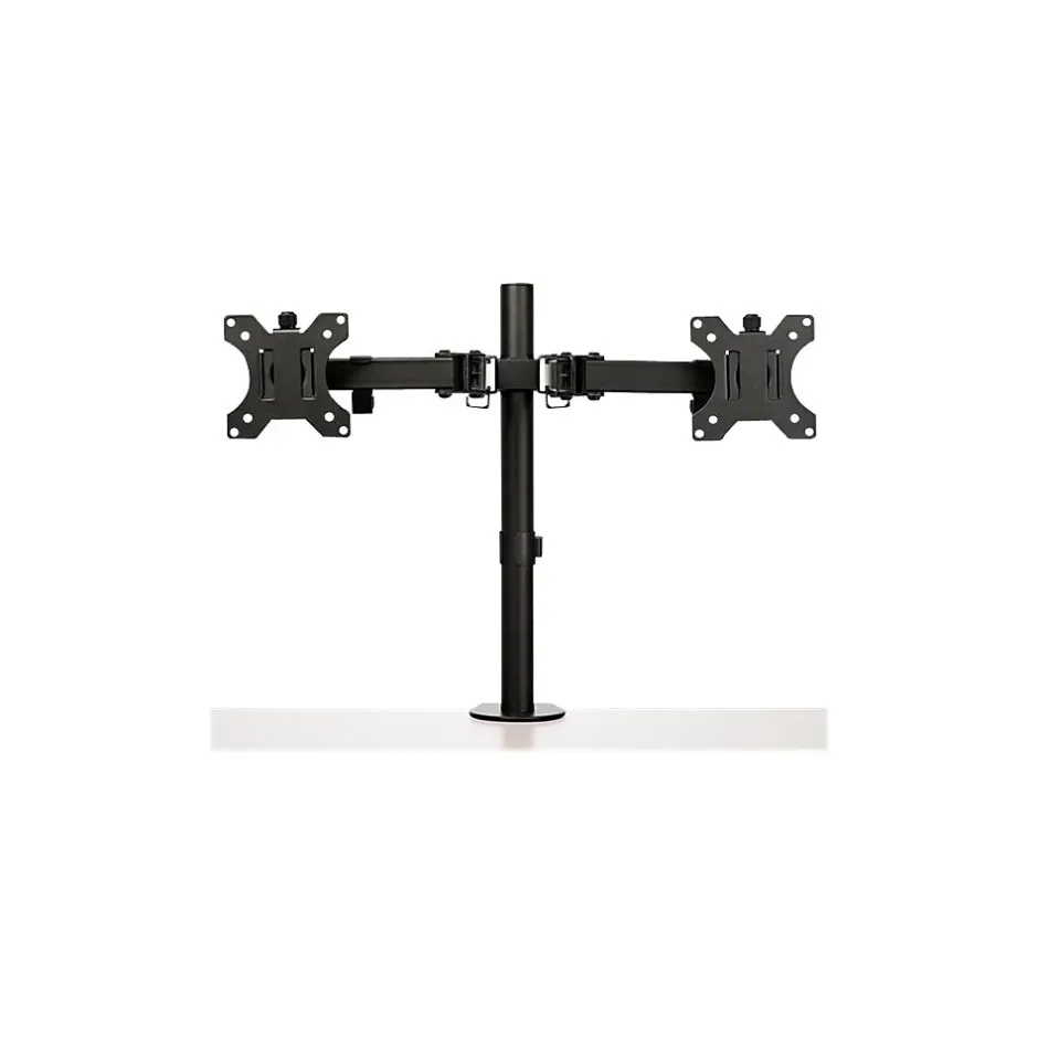 - WIDE RANGE OF MOTION: Double monitor mount increases ergonomic comfort and productivity with +45/-45° tilt, +90/-90° swivel, 360° rotating display, and adjustable height along the 15.7″ (39.8 cm) pole
